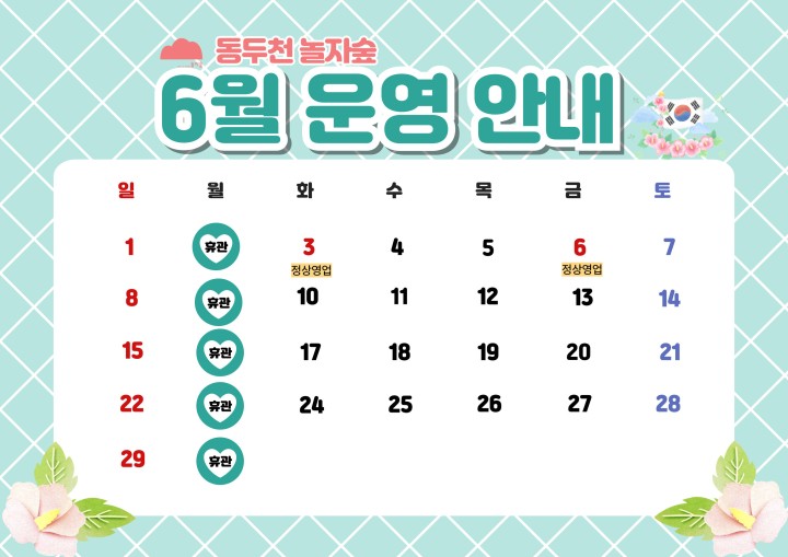 동두천 놀자숲 2025년 6월 운영 및 휴관 안내입니다.