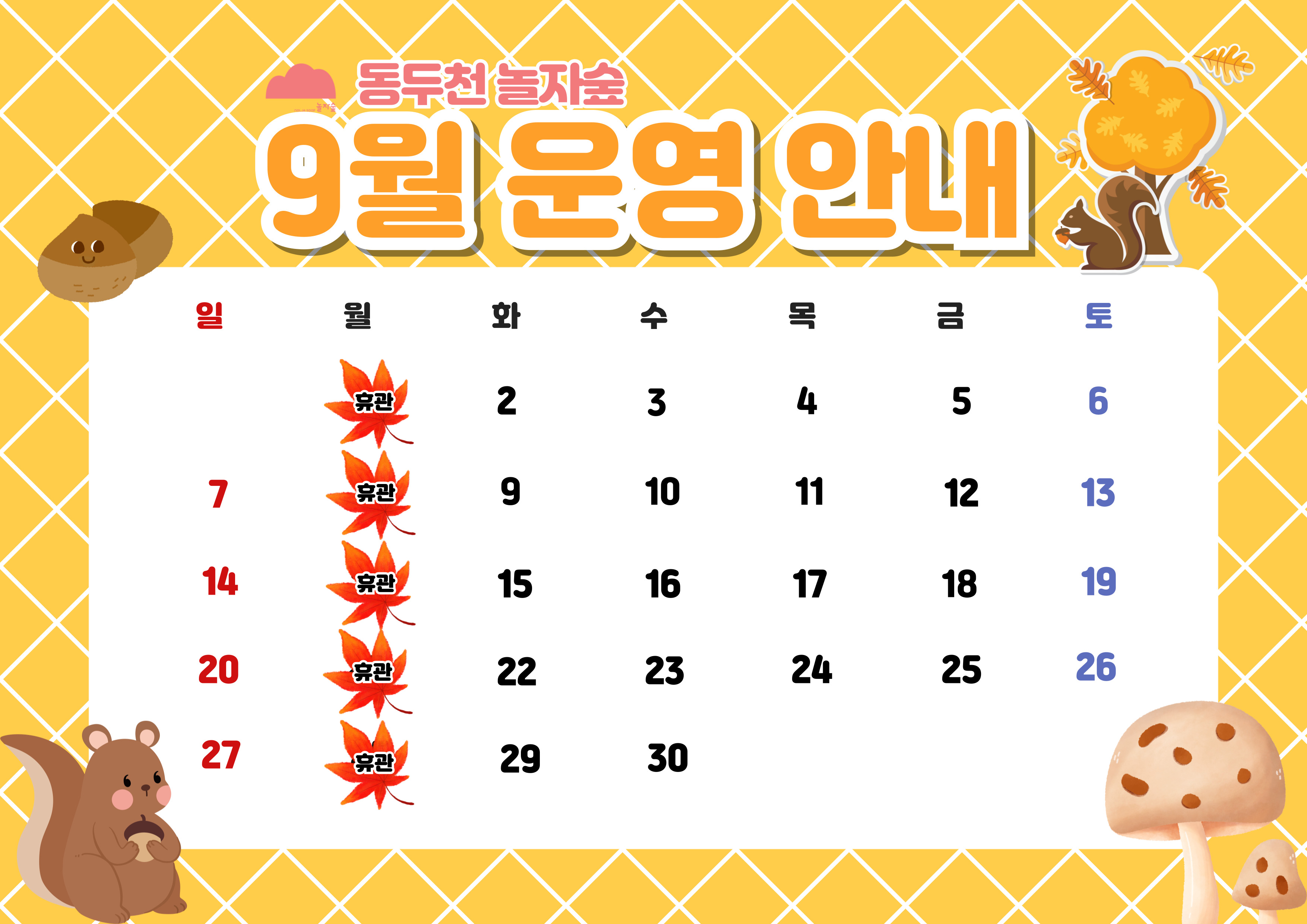 공지사항 2025년 9월 운영 안내 작성자 놀자숲 작성일 2025-09-16 08:17 조회 131 동두천 놀자숲 2025년 9월 운영 및 휴관 안내입니다. 9/1, 8, 15, 22, 29은 월요일로 정기휴관일입니다. 이용에 착오 없으시길 바랍니다. 운영시간 : 화~일요일, 실내 10 ~ 18시, 실외 10~17시 좋아요 0 싫어요 0 인쇄 « 2025년 8월 운영 안내 외부음식물 반입 금지 안내 (22년 12월 1일부터 시행) » 목록보기 Powered by KBoard